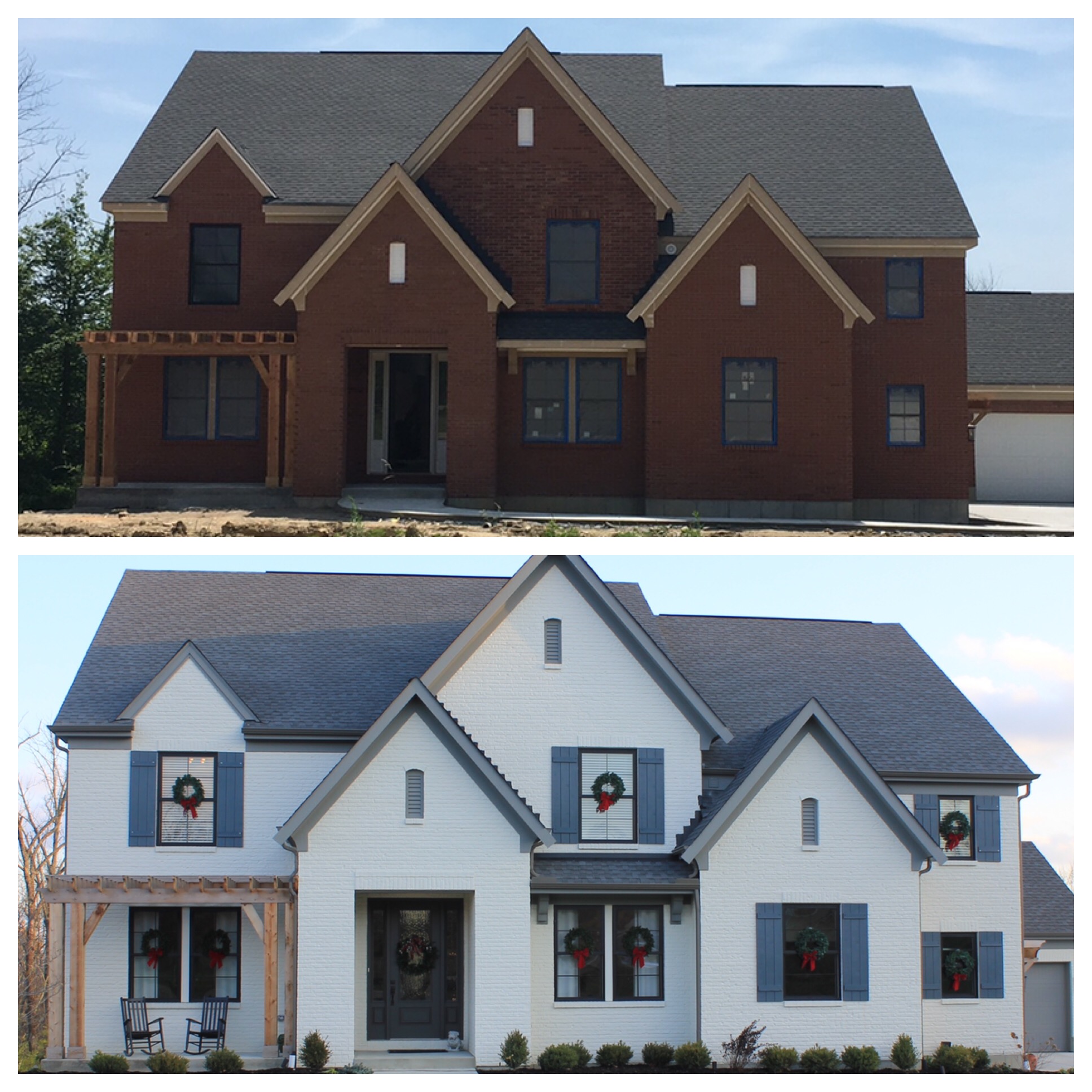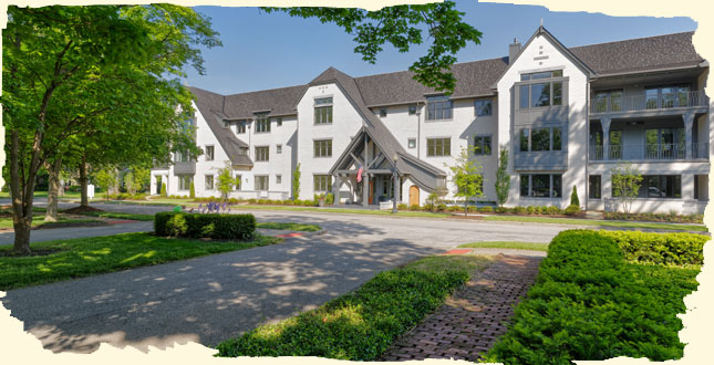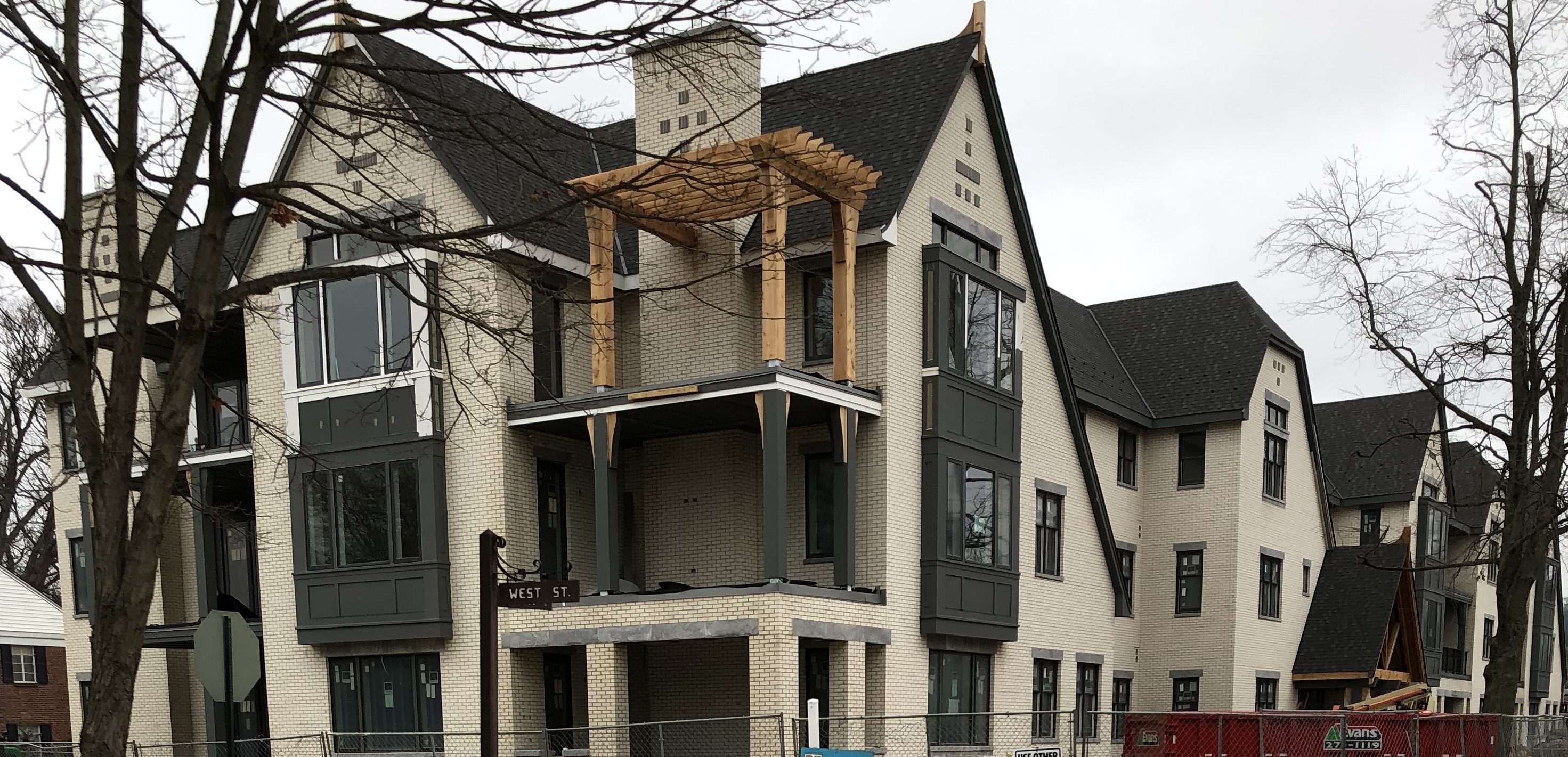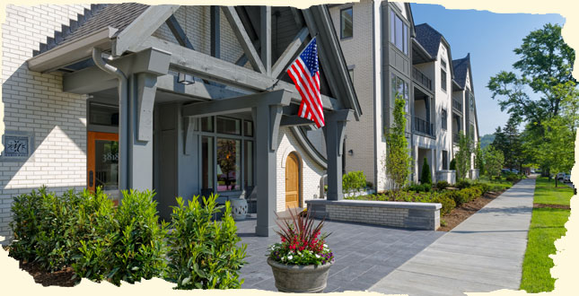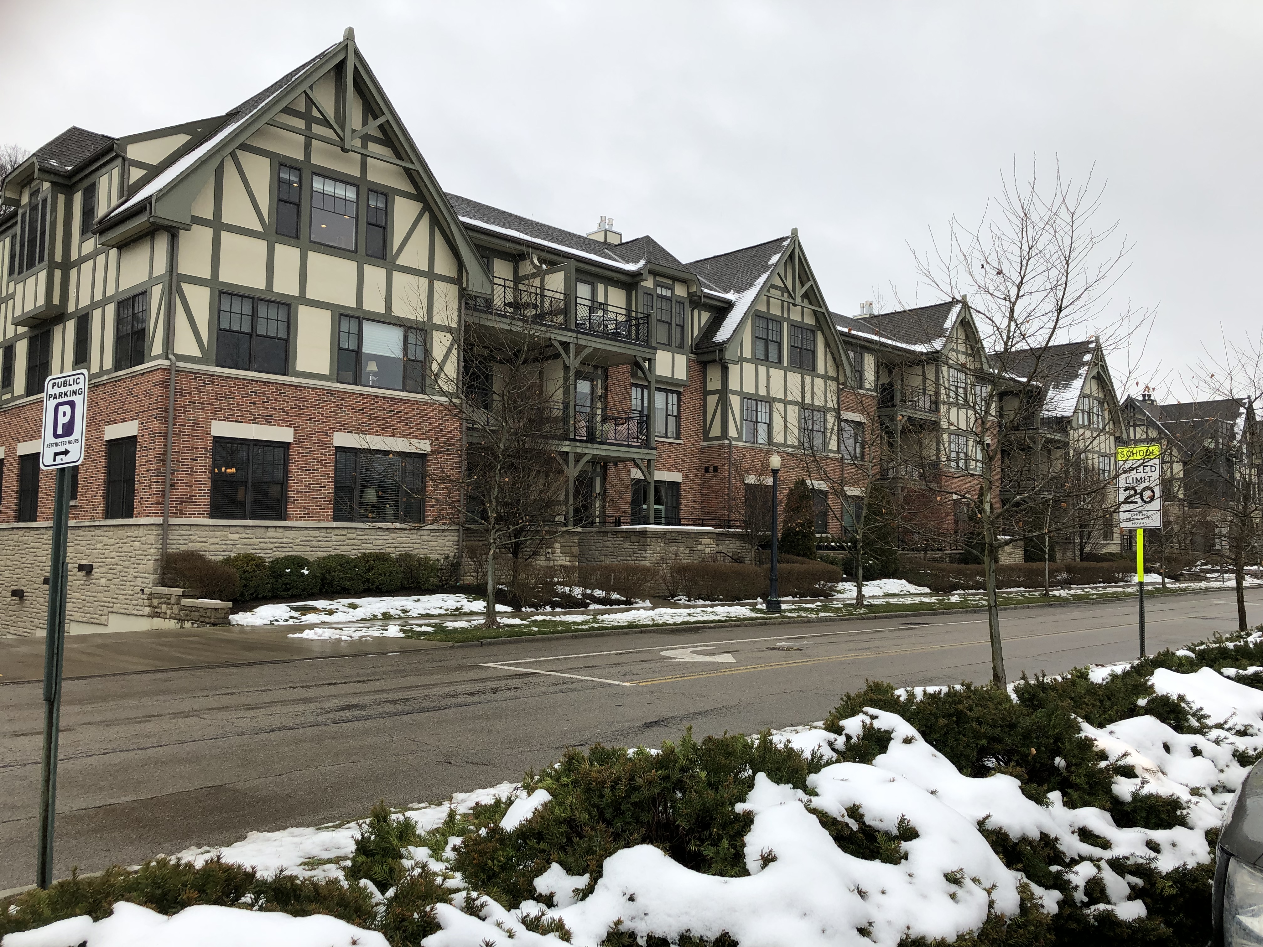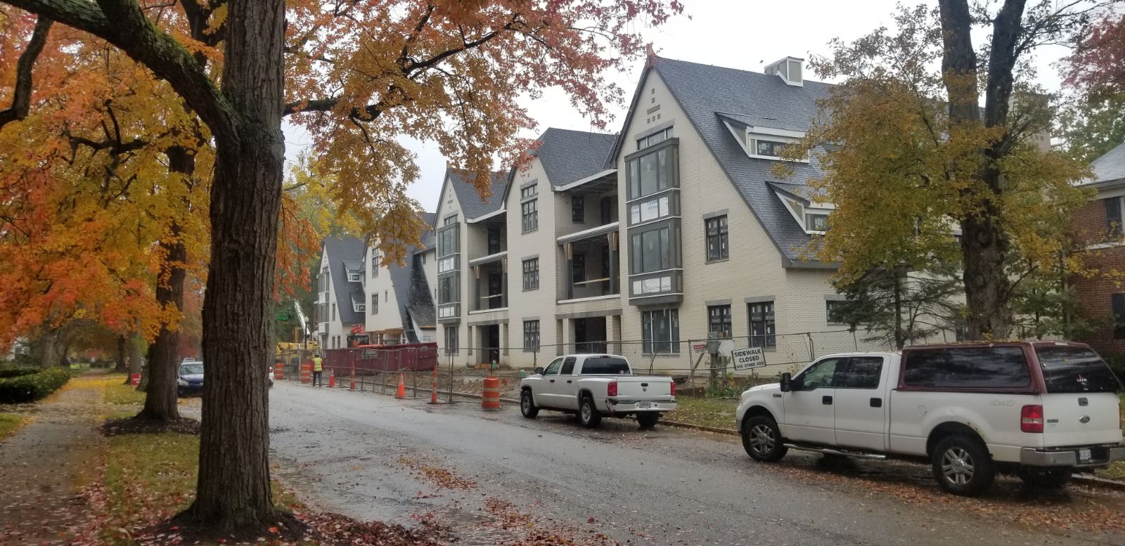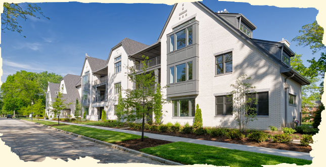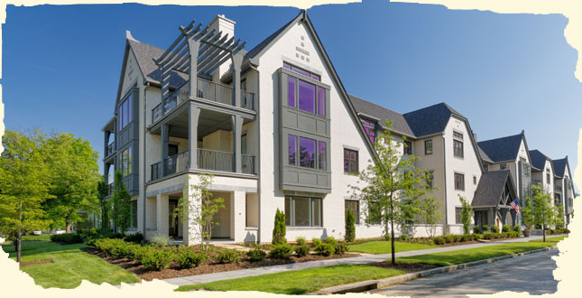 Location Mariemont, Ohio. The architecture is a modern take on English Cottage design with its steep gables and white brick construction.